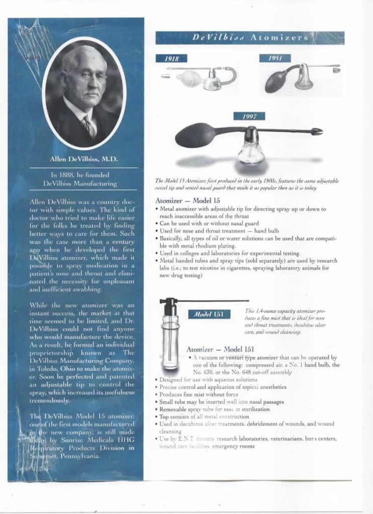 Ο Dr. Allen DeVilbiss ένας γιατρός από το Οχάιο των ΗΠΑ, θεωρείται ο εφευρέτης του πρώτου ψεκαστήρα (που οδήγησε στο νεφελοποιητή) τη δεκαετία του 1880, δημιουργώντας μια συσκευή για ιατρική χρήση συνδυάζοντας ένα λαμπτήρα, σωλήνες και ένα δοχείο λαδιού, θέτοντας τις βάσεις για την εταιρεία DeVilbiss, που έκανε γνωστό το όνομά της και στους νεφελοποιητές που χρησιμοποιούμε σήμερα.